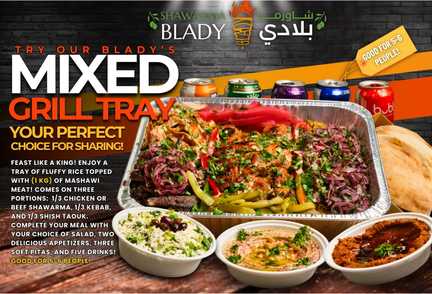 Level up your event with Shawarma Blady’s authentic catering — from platters to poutine.